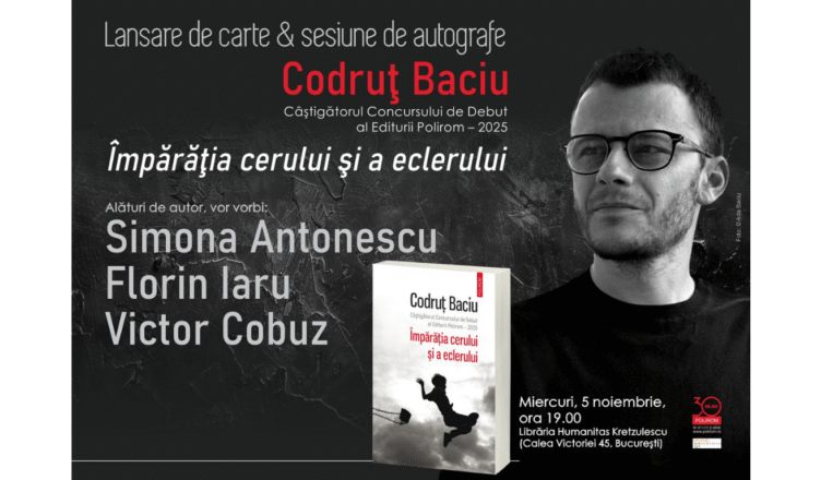Editura Polirom vă invită miercuri, 5 noiembrie, ora 19.00, la Librăria Humanitas Kretzulescu (Calea Victoriei 45, Bucureşti), la lansarea volumului Împărăţia cerului şi a eclerului de Codruț Baciu, Câştigătorul Concursului de Debut al Editurii Polirom – 2025.