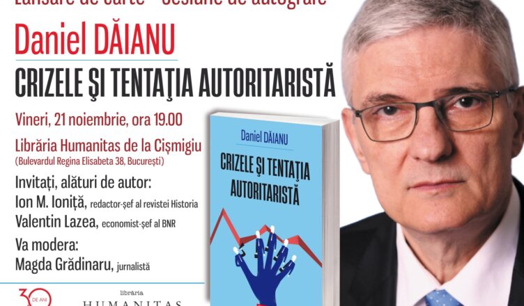 Vineri, 21 noiembrie, ora 19.00, la Librăria Humanitas de la Cișmigiu (Bulevardul Regina Elisabeta 38, București), va avea loc lansarea volumui Crizele și tentația autoritaristă de Daniel Dăianu, publicat de curând la Editura Polirom.